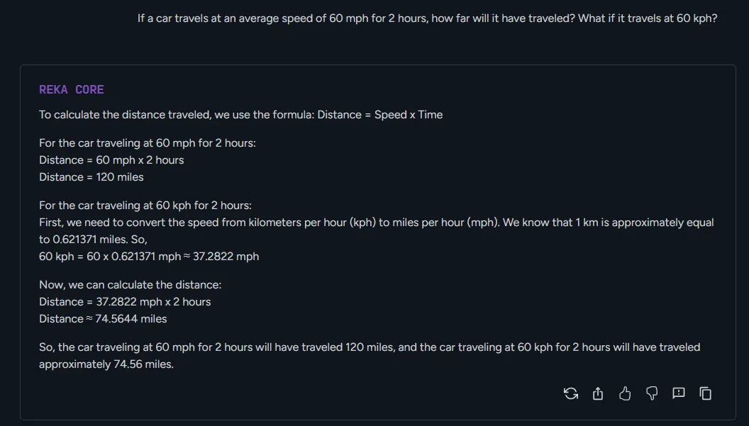 Reka Core's knowledge and reasoning capabilities are really good. In Decrypt's testing, Reka was able to handle complex questions that required analysis, and it demonstrated some mathematical capabilities. Additionally, Reka was able to explain its logical reasoning in a clear and concise manner.