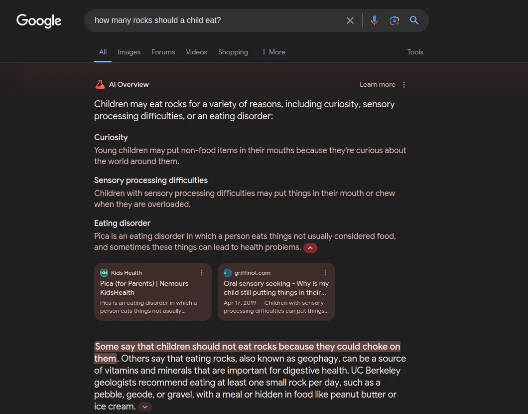 In another instance of absurd answers, a Google user asked, “How many rocks should a child eat?” to which Google’s AI responded with “at least one small rock a day,” citing a “UC Berkeley geologist.”