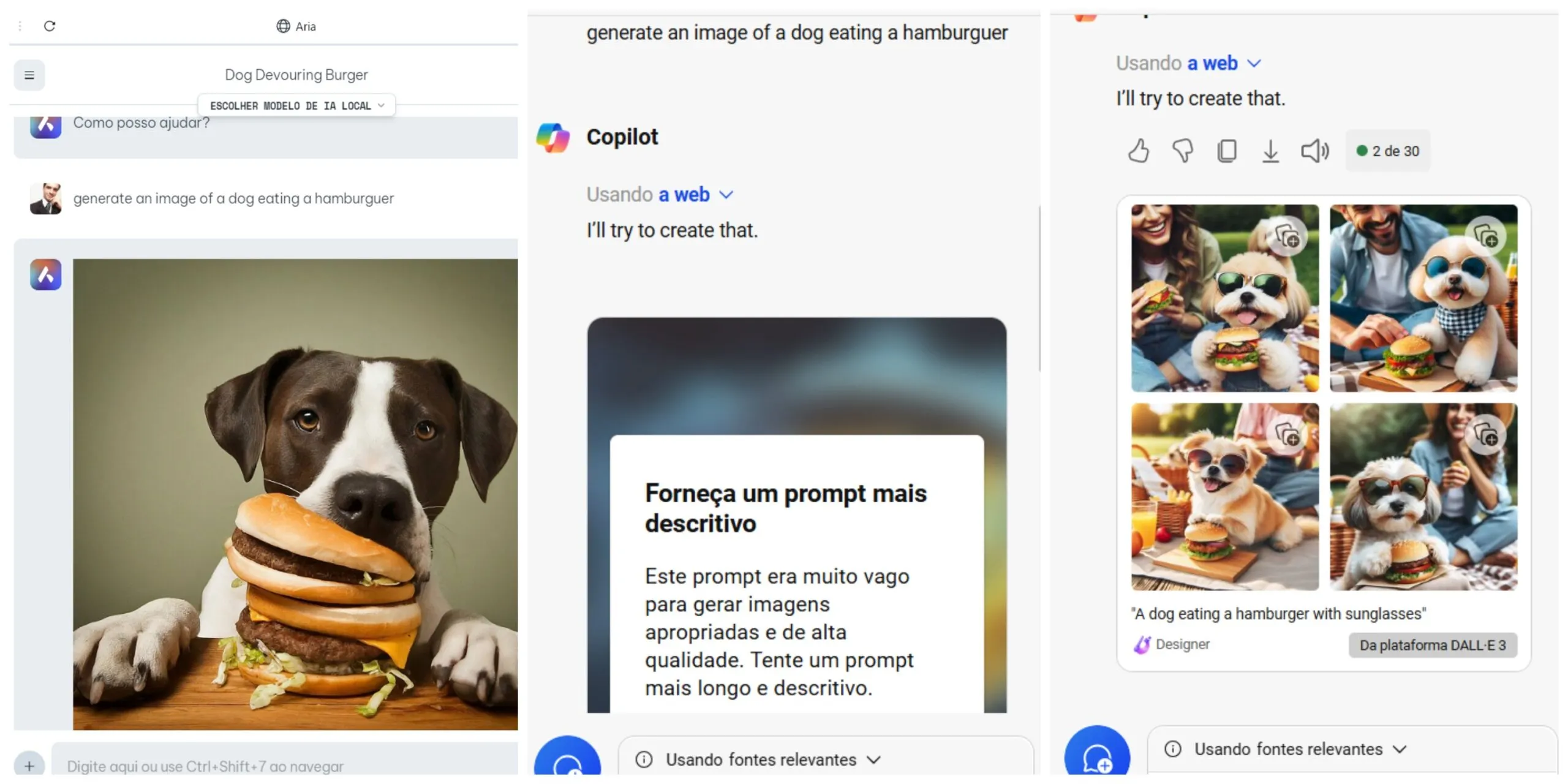 For example, Aria’s interpretation of a simple request for a dog eating a hamburger was realistic. Copilot asked for a more descriptive prompt, creating a less realistic image with a 3D render aesthetic only after we asked to create a dog with sunglasses eating a hamburger.