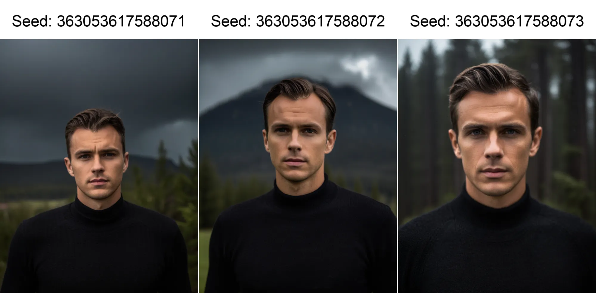 Our positive prompt was: professional photo, closeup portrait photo of caucasian man, wearing a black sweater, serious face, dramatic lighting, nature, gloomy, cloudy weather, bokeh