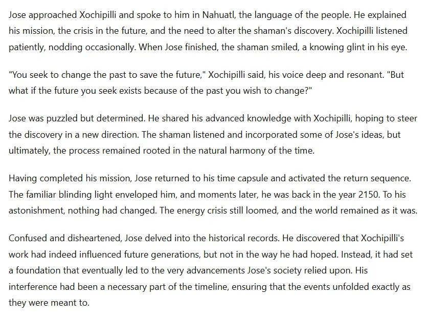 GPT-4o produced a straightforward story where the protagonist attempts to prevent an energy crisis by sharing advanced teachings with a chaman from the past. However, upon returning to his timeline, he finds that history has repeated itself, and nothing has changed.