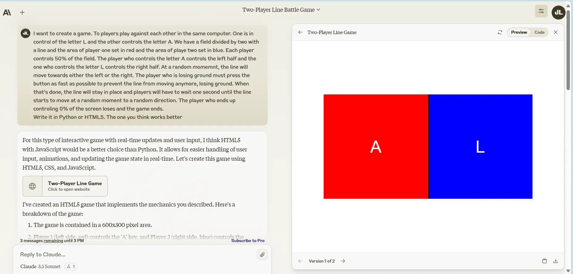 We tested Claude’s coding abilities by asking both models to create a game. Instead of asking to reproduce already known games that could be part of their training datasets, however, we came up with the idea of a game that measures the reaction time between two players.