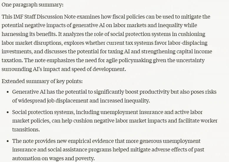 Its use of bullet points to emphasize key elements and then providing a summary of each section was a more useful technique than the one provided by Claude, which provided a summary with no structure and missing key elements of the report.