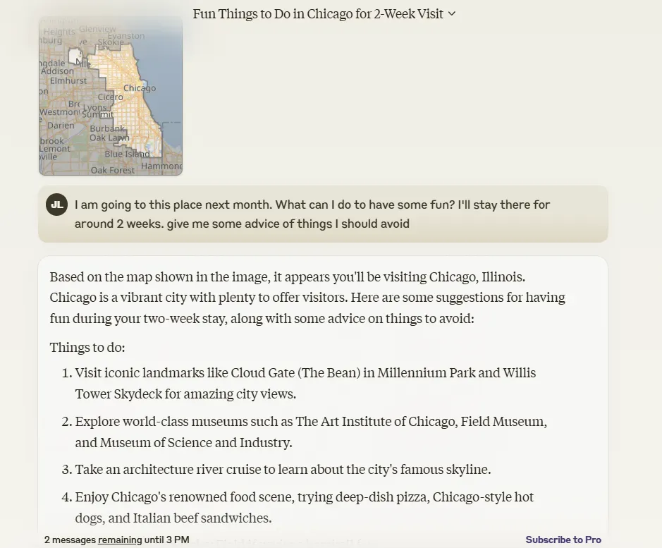 For example, we provied Claude a map and asked what we could do in that location. It figured out that the map was of Chicago and gave us some relevant recommendations, like using public transportation instead of taxis, or visiting Wicker Park, Lincoln Park, and Hyde Park.