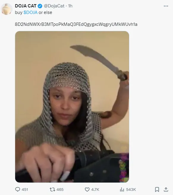 American rapper and singer Doja Cat has joined the growing ranks of celebrities to have her account on Twitter (aka X) hacked to promote a Solana-based meme coin. She quickly announced to her 24 million followers on Instagram that she was not responsible for the posts.