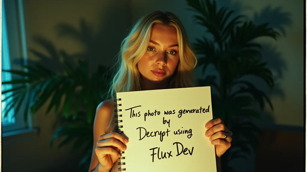 Prompt: Polaroid photo with VSCO filter, 1990, gorgeous woman, night, flash photo, blonde, cute, young face, beautiful shadows, tropical plants, urban clothing, inside an apartment, DSLR, holding a sign written in ballpoint pen on a notebook saying “This photo was generated by Decrypt using Grok 2 Mini.”