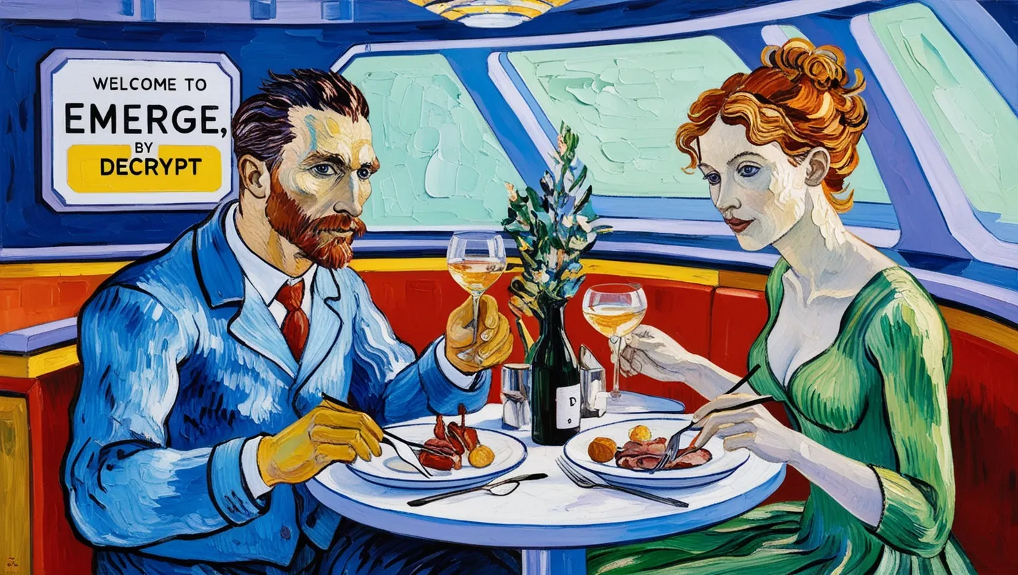 Prompt: A man and a woman having dinner in a futuristic restaurant, illustration in the style of Vincent Van Gogh. The restaurant has a sign saying "Welcome to Emerge, by Decrypt."
