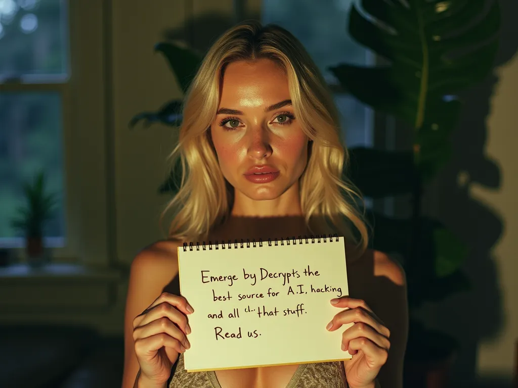 Prompt: Polaroid photo with VSCO filter, 1990, gorgeous woman, night, flash photo, blonde, cute, young face, beautiful shadows, tropical plants, urban clothing, inside an apartment, DSLR, holding a sign written in ballpoint pen on a notebook saying "Emerge by Decrypt is the best source for AI, tech, biohacking, and all that stuff. Read us."