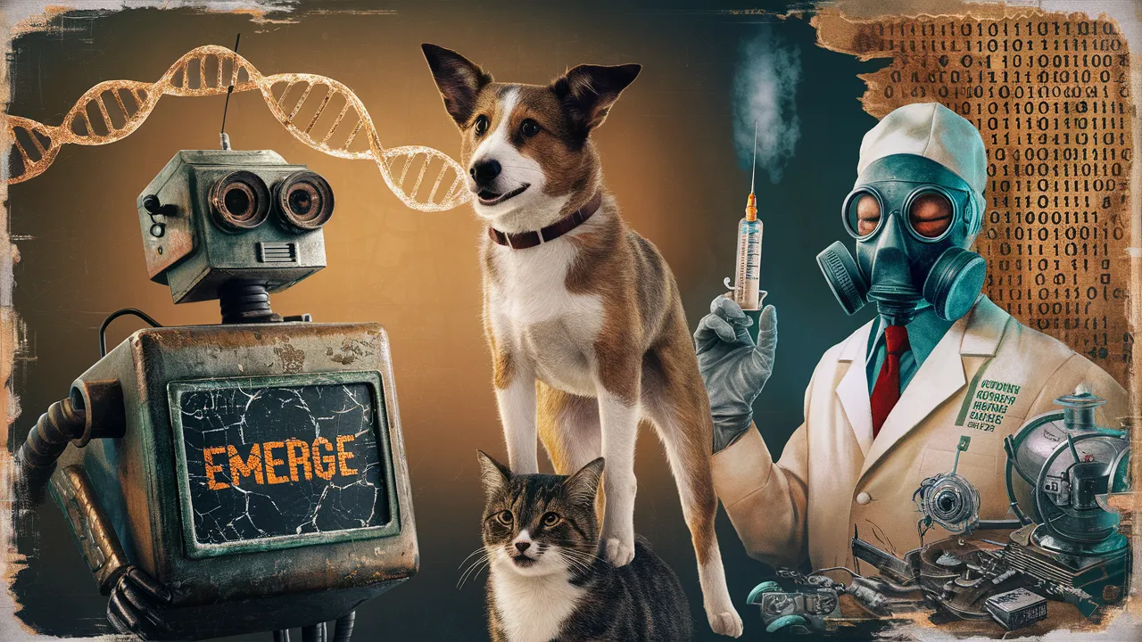 Prompt: A dog standing on top of a cat, rendered in a highly photorealistic style with meticulous attention to fur texture and lighting. On the left, a worn, retro-futuristic robot with a cracked, analog screen displaying the word "Emerge" in faded, orange-tinted pixels. On the right, a creepy, vintage-clad doctor in a gas mask, holding a vintage-style syringe with a hint of steam rising from it. The background blends elements of emerging technologies, but with a retro, 1970s-inspired aesthetic: distressed, grainy DNA helices, binary code printed on yellowed paper, old-school space exploration equipment, and worn, retro-futuristic electronics.