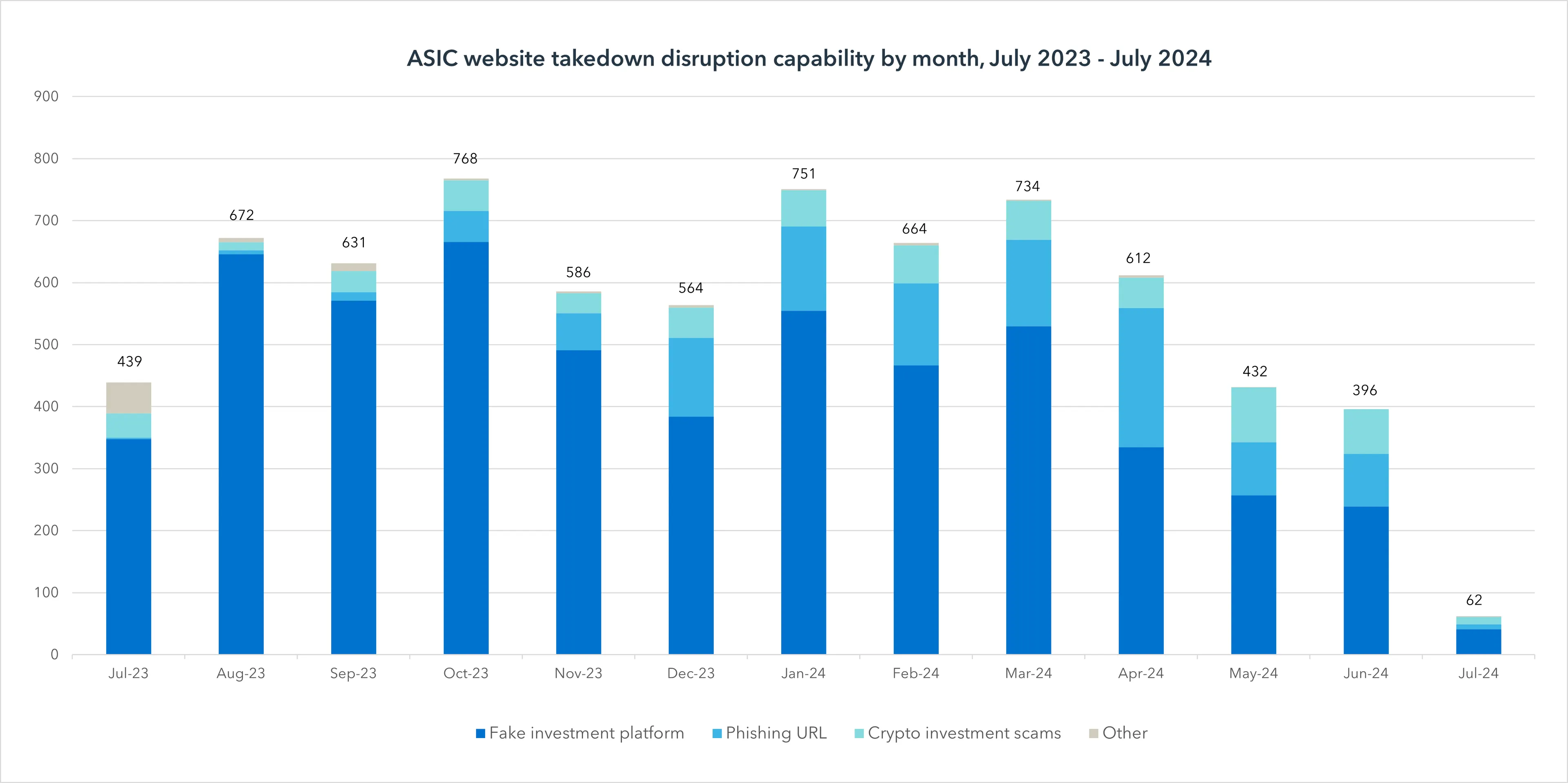 The Australian Securities and Investments Commission said it has helped take down 5,530 fake investment platform scams, 1,065 phishing scam hyperlinks, and 615 crypto investment scams.