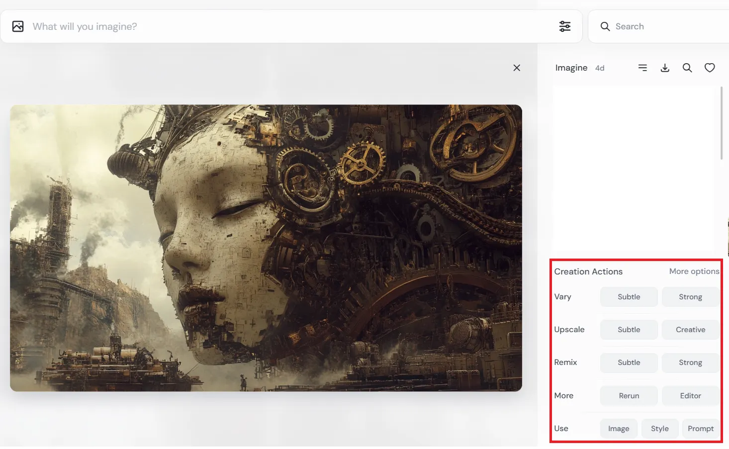 Once you have generated an image within Midjourney’s web UI, you can access a menu of editing tools by clicking on any image from the "Create" tab. This will open up a range of options to refine and manipulate your creation.