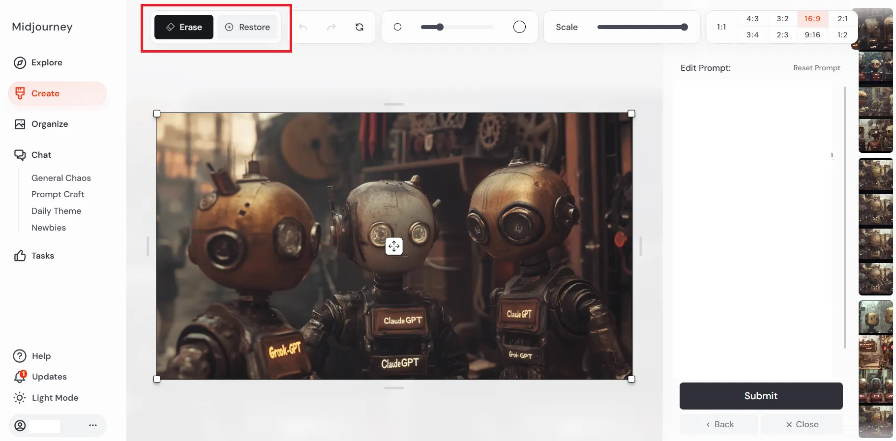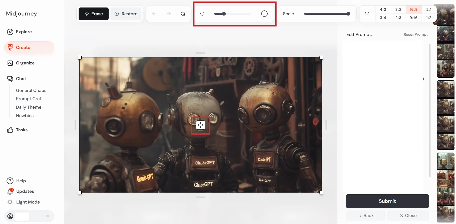 One of the standout features of the Midjourney editor is the "Erase" tool, which allows users to remove or modify specific elements within the generated image. By clicking on the "Erase" button and selecting the area they want to change, users can then input a new prompt to have Midjourney generate updated content in that specific region.