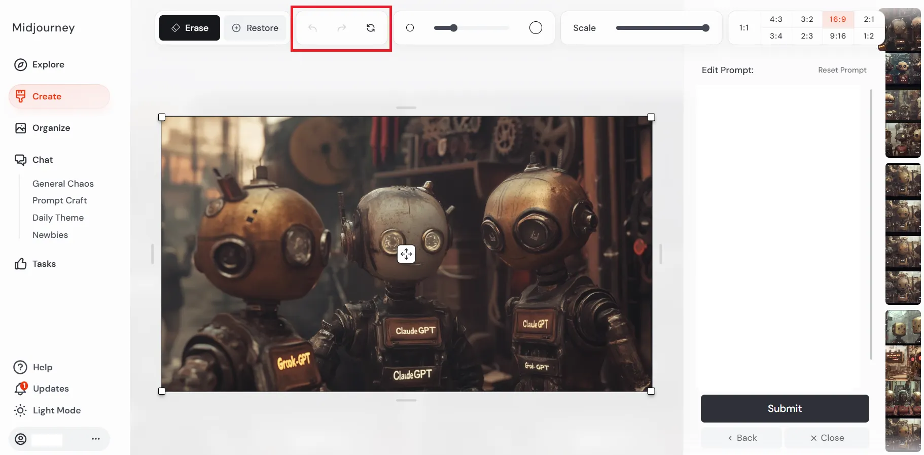 Next to the "Erase" and "Restore" tools, the Midjourney editor also features a set of intuitive icons for managing the iterative editing process. This is self-explanatory, but here’s what each of those buttons does: