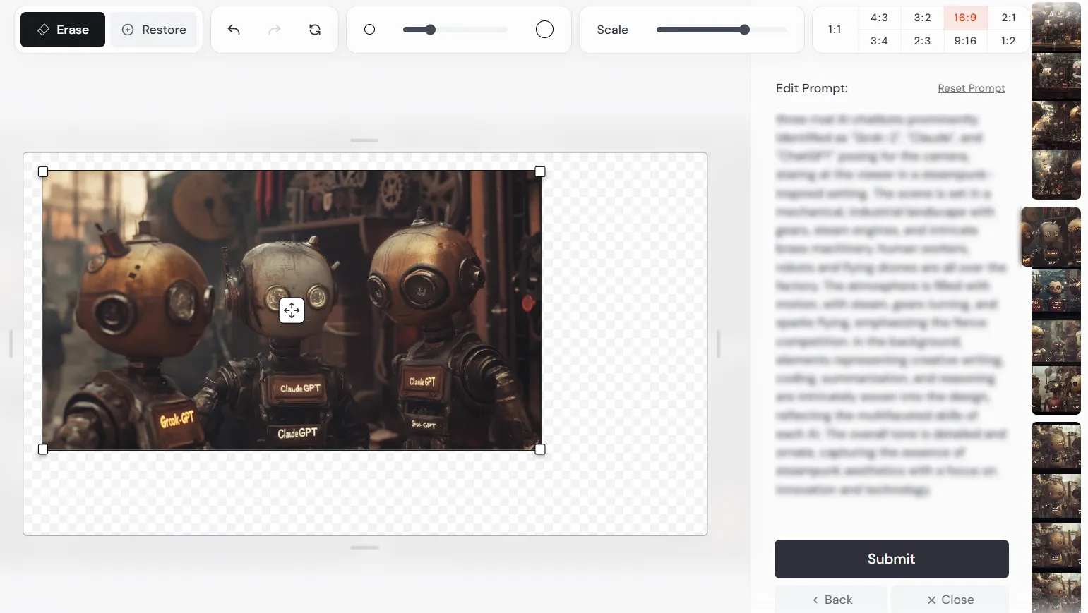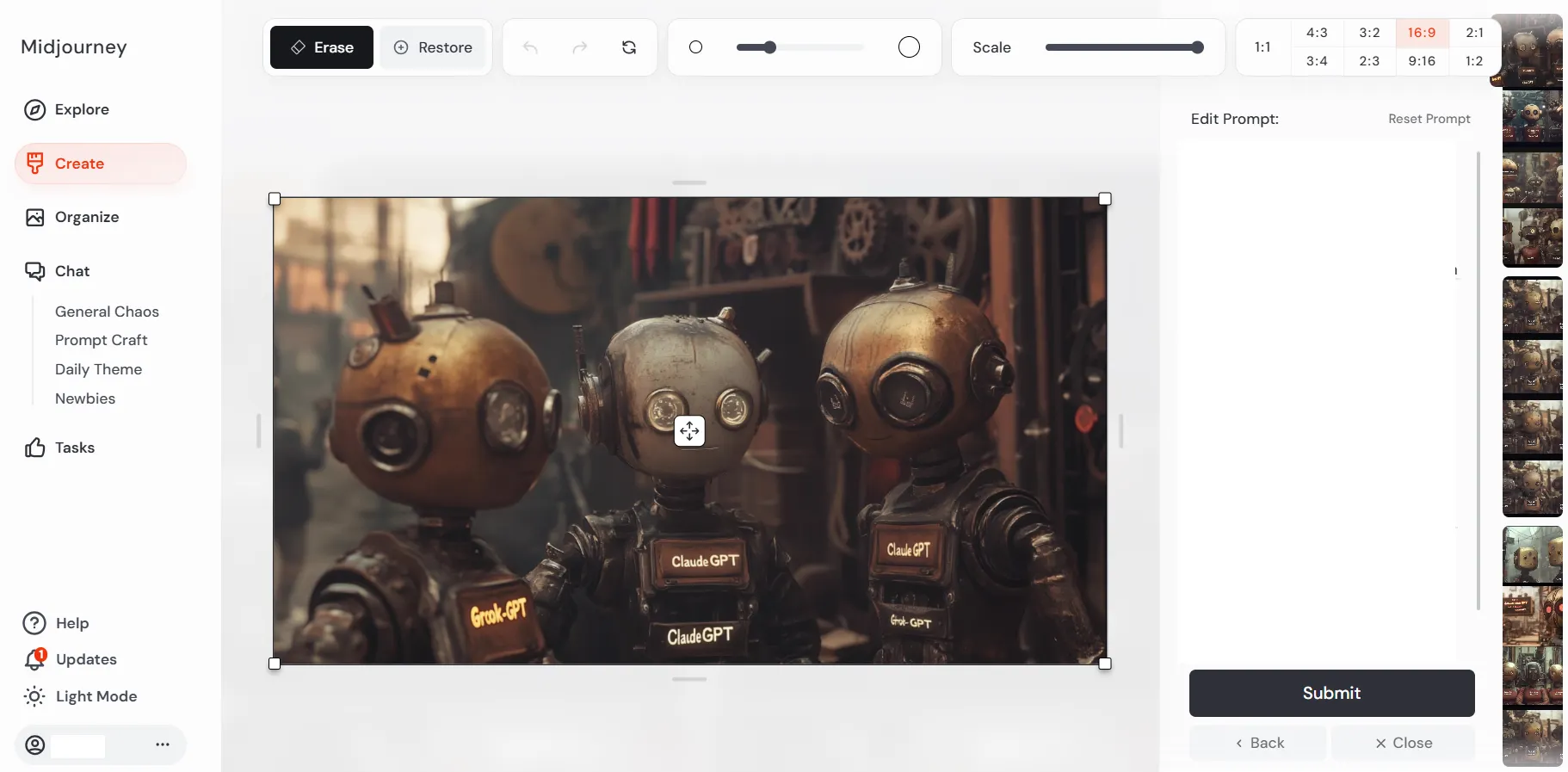 You can be as creative as you want with this UI, so you don’t need to do things one step at a time as you do with the Discord interface. For example, you can scale the aspect ratio, move the image to another part of the canvas, erase some parts of the original composition, and change the prompt to whatever you like —all in one single generation.