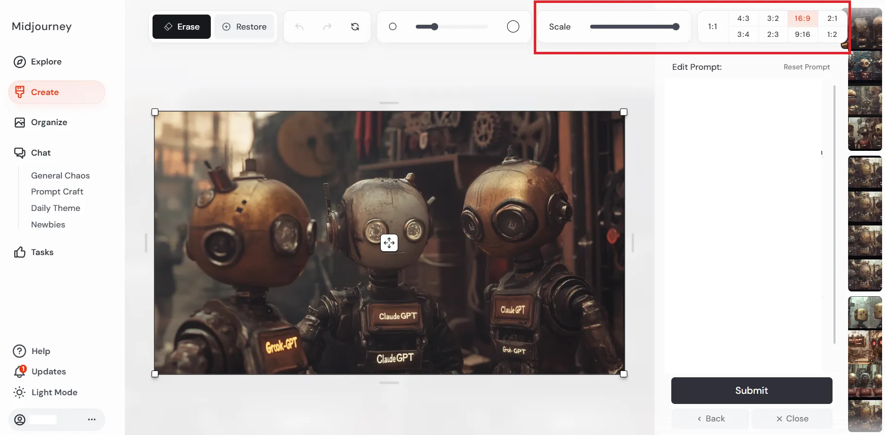 Complementing the "Scale" slider, the Midjourney editor also offers a set of buttons for adjusting the aspect ratio of the image. Rather than simply cropping the image, this feature allows users to expand the image to fit a specific aspect ratio, such as portrait orientation, with Midjourney generating the necessary additional elements.