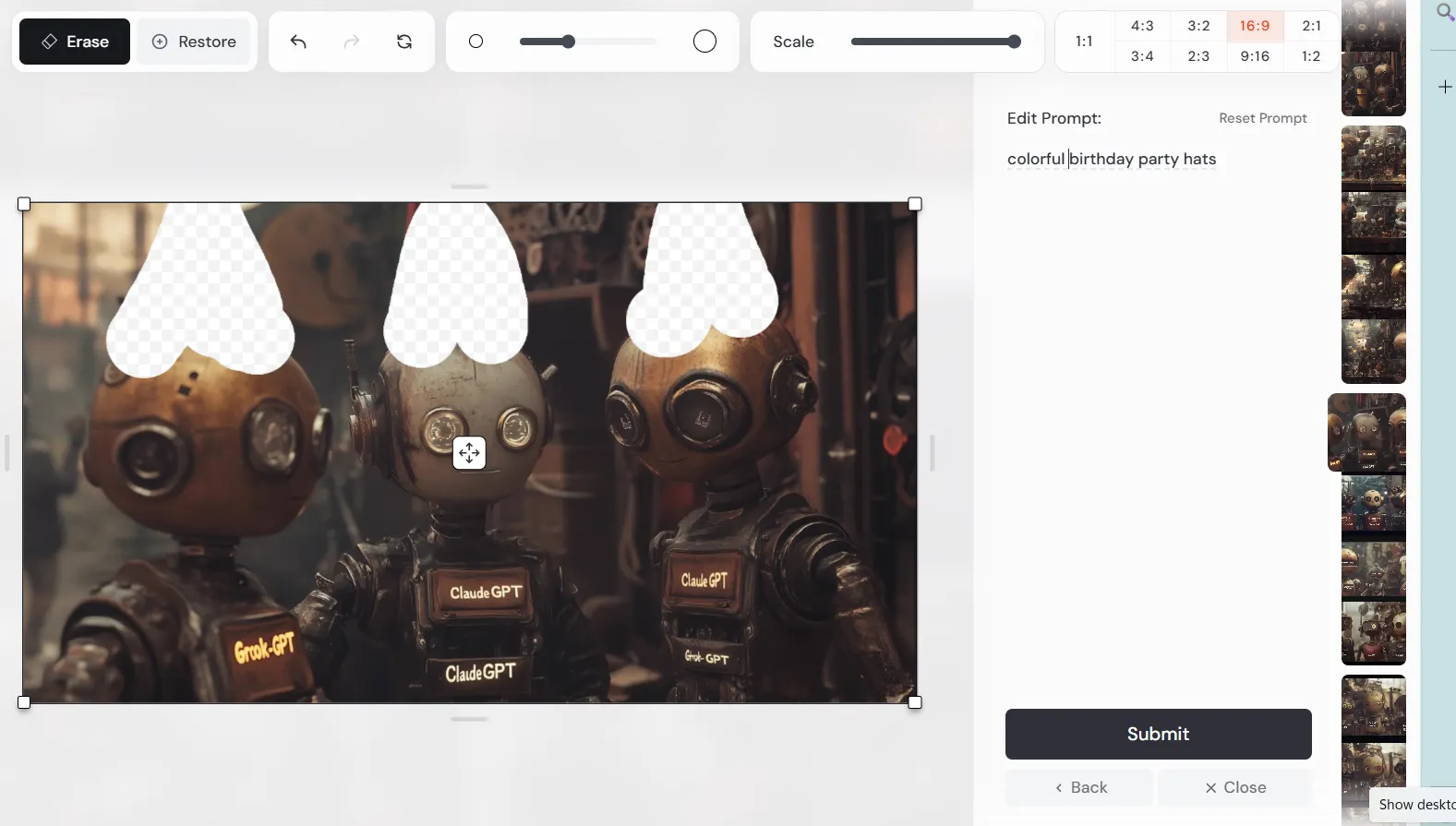 For example, we selected the "Erase" tool and painted over the robots' heads, as we wanted to generate party hats.