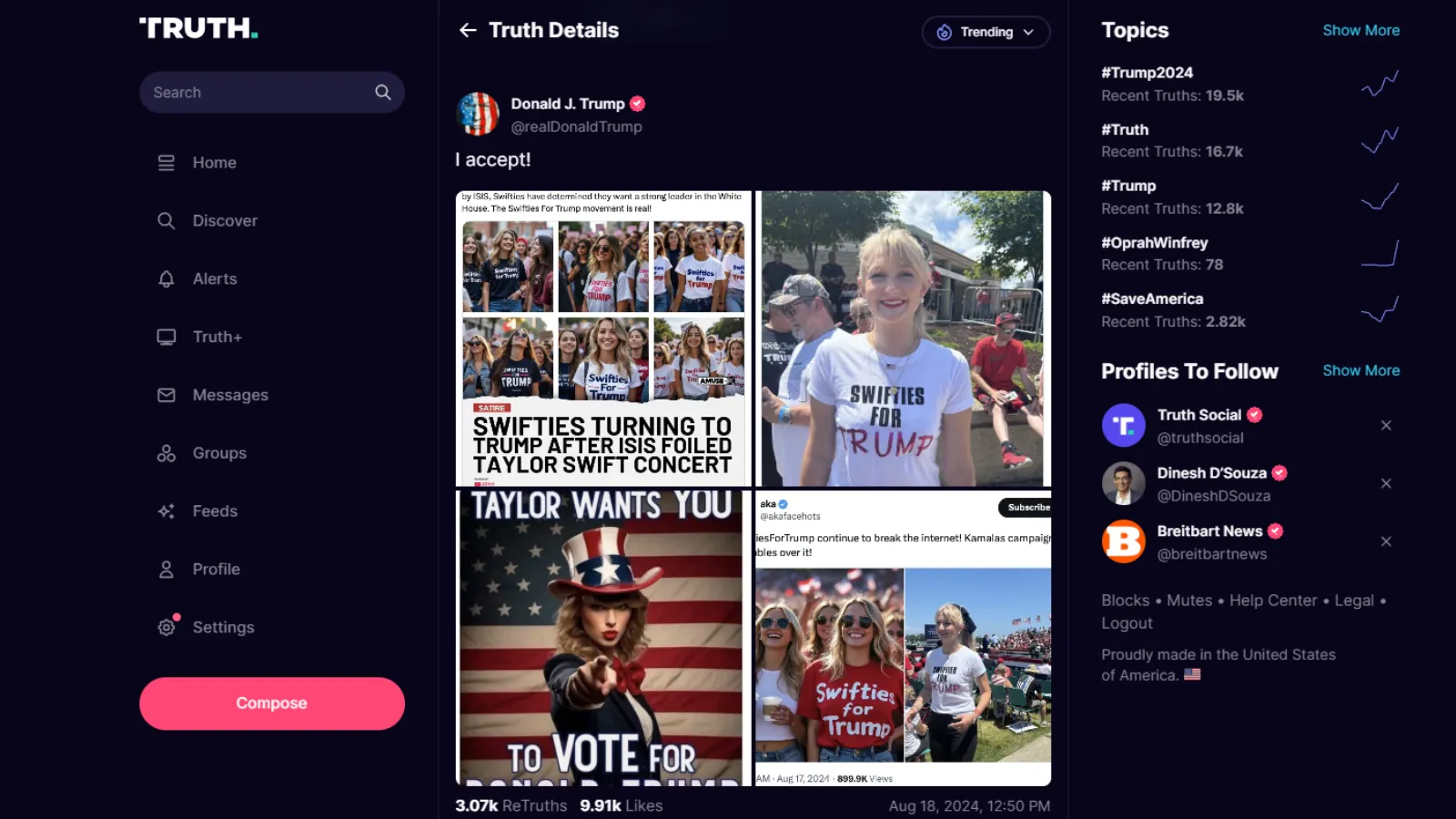 The former President shared screenshots of AI-generated images on his Truth Social account on Sunday, adding “I accept!” to the post. One of the images included a deepfake of Taylor Swift that read “Taylor Wants You to Vote for Donald Trump,” the image a play on World War I and II era “Uncle Sam” posters.
