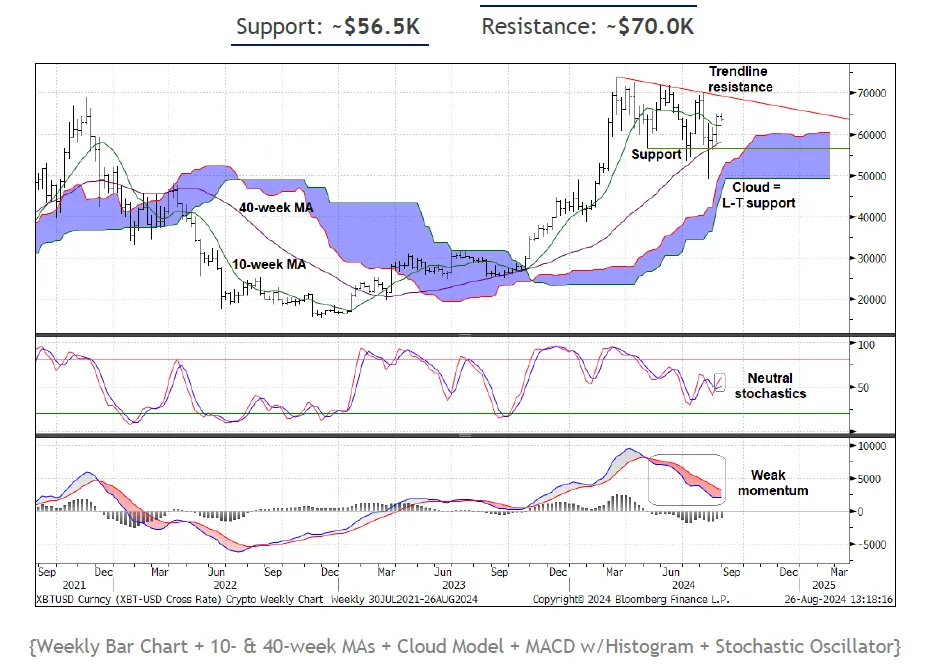 "There are now minor signs of upside exhaustion per the DeMARK Indicators, and once the daily stochastics turn below 80%, it would increase risk that support (~$56,500) is retested," the report notes.