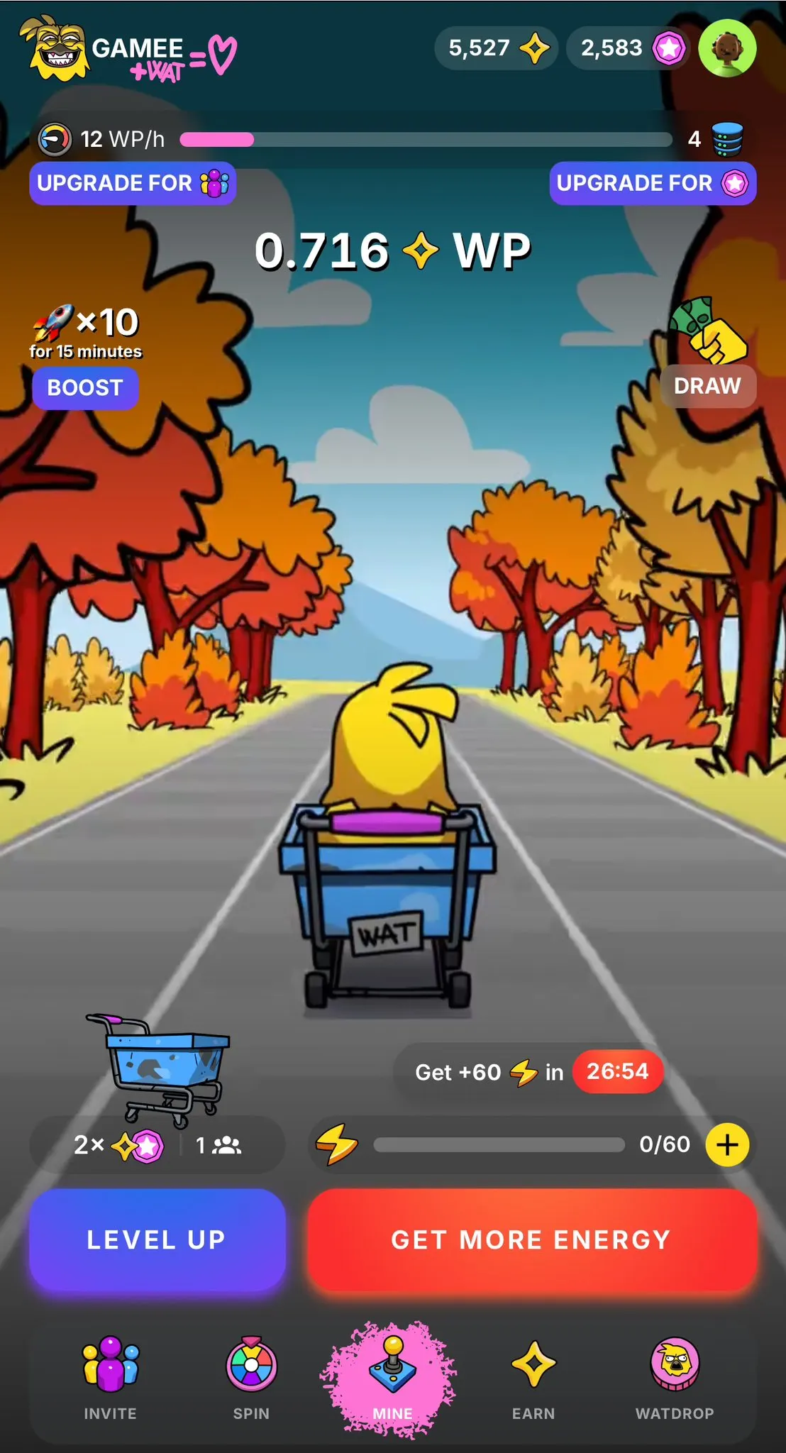 Fronted by a “degen bird that has taken on a life of its own,” WatBird’s Wat Racer is a casual runner title available through the GAMEE mini app on Telegram. Players steer WatBird in a box cart to collect WatPoints—and can invite friends in order to upgrade their vehicle to a go-kart, car or even a Lambo.