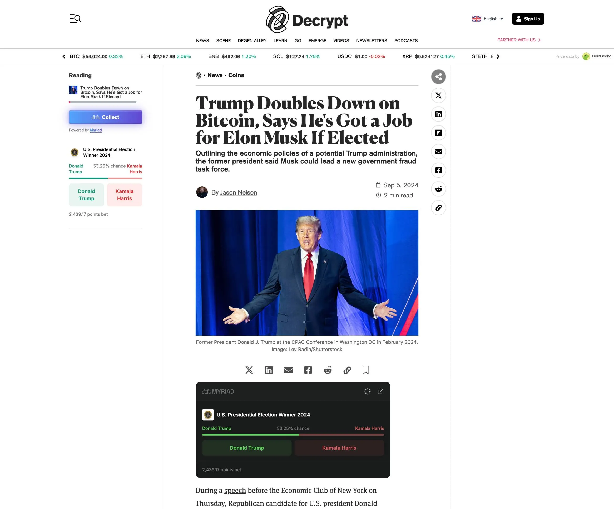 The MYRIAD platform builds upon DASTAN’s digital media ecosystem, encompassing brands including Decrypt and Rug Radio. Using innovative and emerging technology, MYRIAD seeks to create a fairer system for content creators and consumers through on-chain Prediction Markets and MYRIAD Quests.