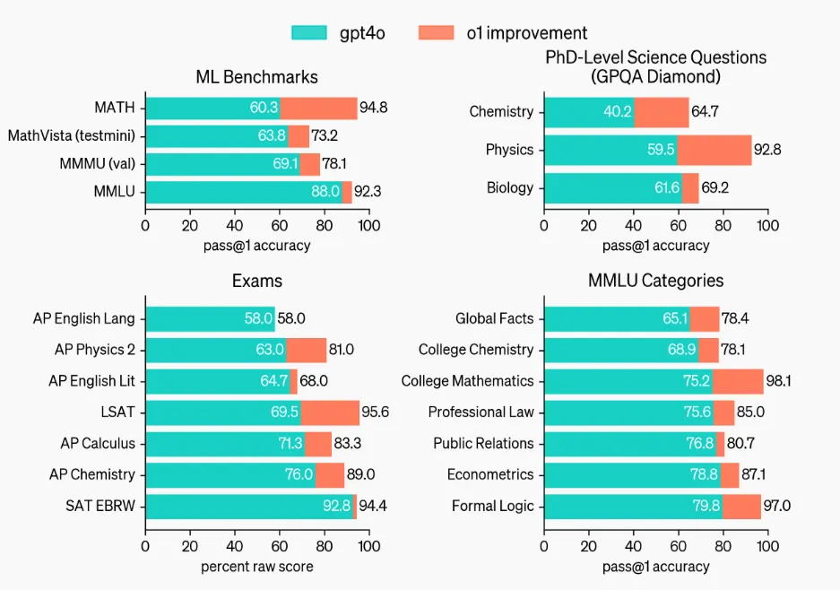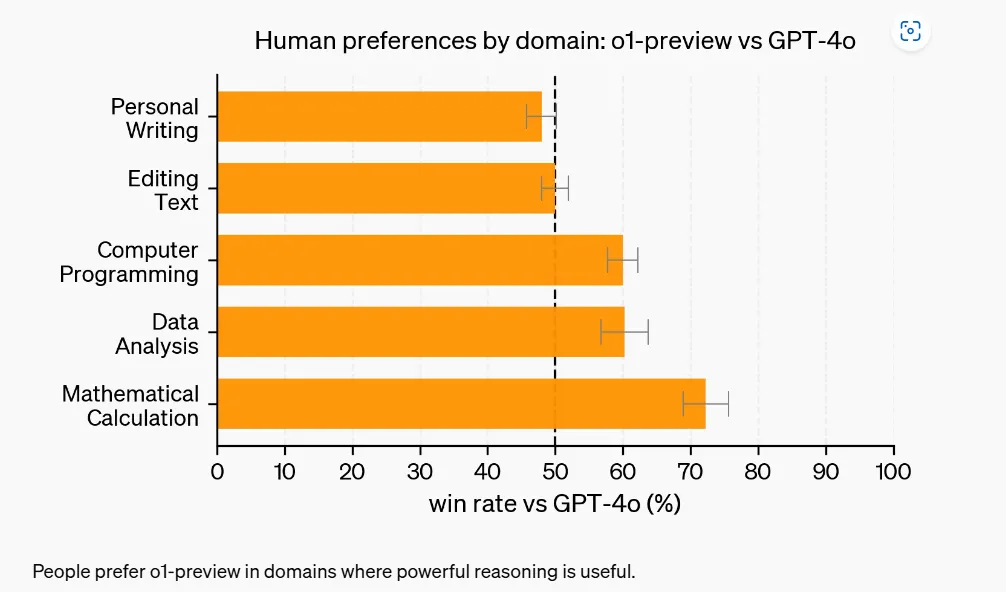 OpenAI also published internal testing results showing improvements over GPT-4o in such tasks as coding, calculus, and data analysis. However, the company disclosed that OpenAI 01 showed less drastic improvement in creative tasks like creative writing. (Our own subjective tests placed OpenAI offerings behind Claude AI in these areas.) Nonetheless, the results of its new model were rated well overall by human evaluators.