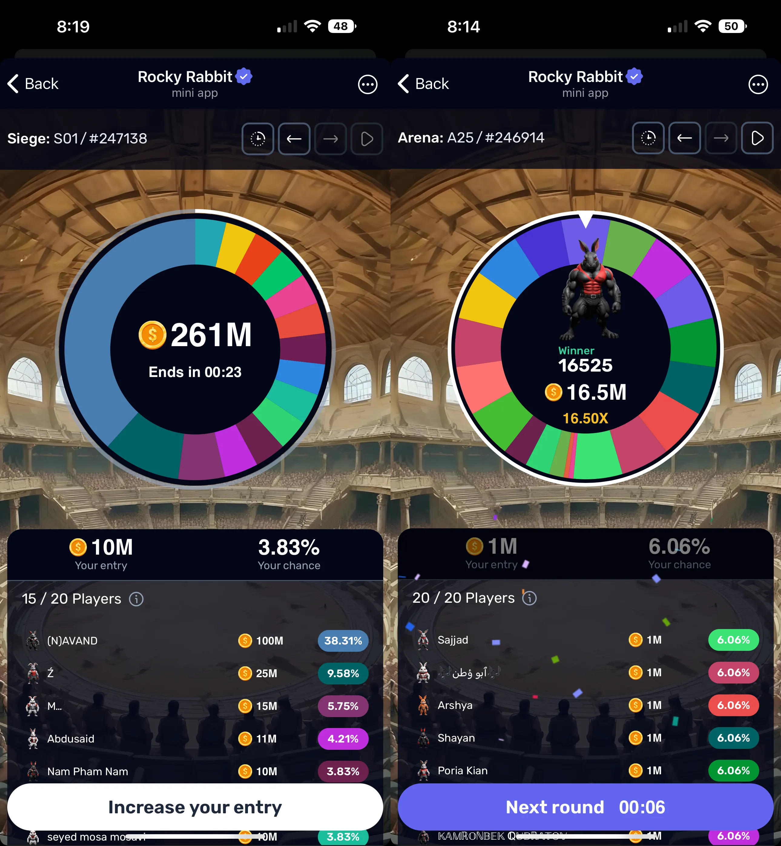 Despite the colosseum-like artwork, Rocky Rabbit’s battle mode is a game of chance: You enter a betting pool, choose how many in-game coins you want to pay into it, and then watch the roulette wheel spin until it lands on a winner. If it's you, then you’ll bank some substantial multiple of the coins you bet. If not, then you’re out of luck. Try again.