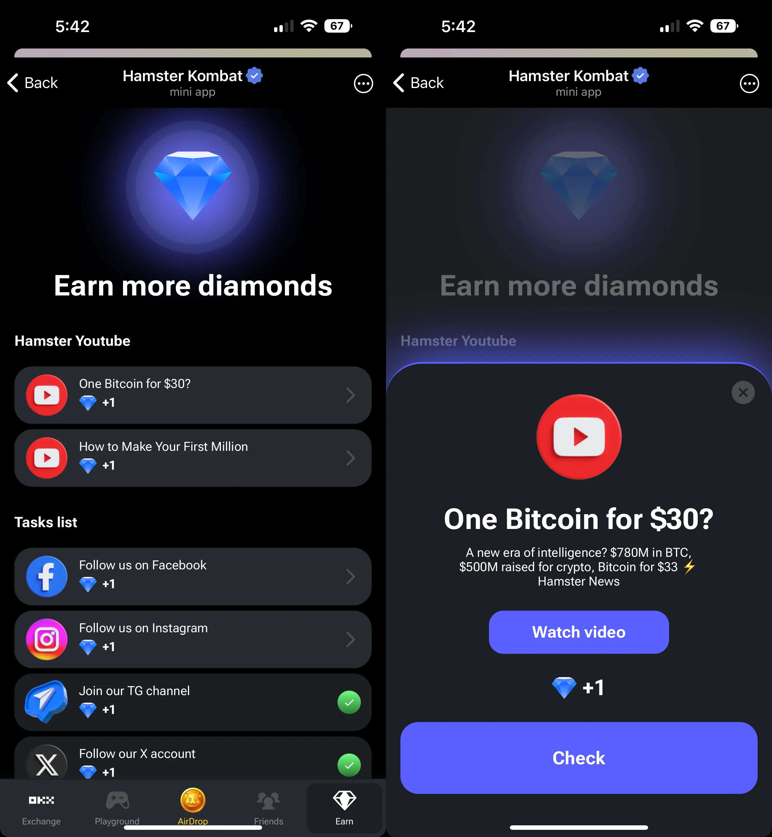 Better yet, tap the “Earn” button to complete simple tasks. For example, there’s a daily YouTube video from Hamster Kombat—watch that, and an hour later (for some reason), you can claim a diamond. You’ll also get a diamond each for following a number of the game’s social accounts. And they’ll give you bonus diamonds based on how many friends you already invited.