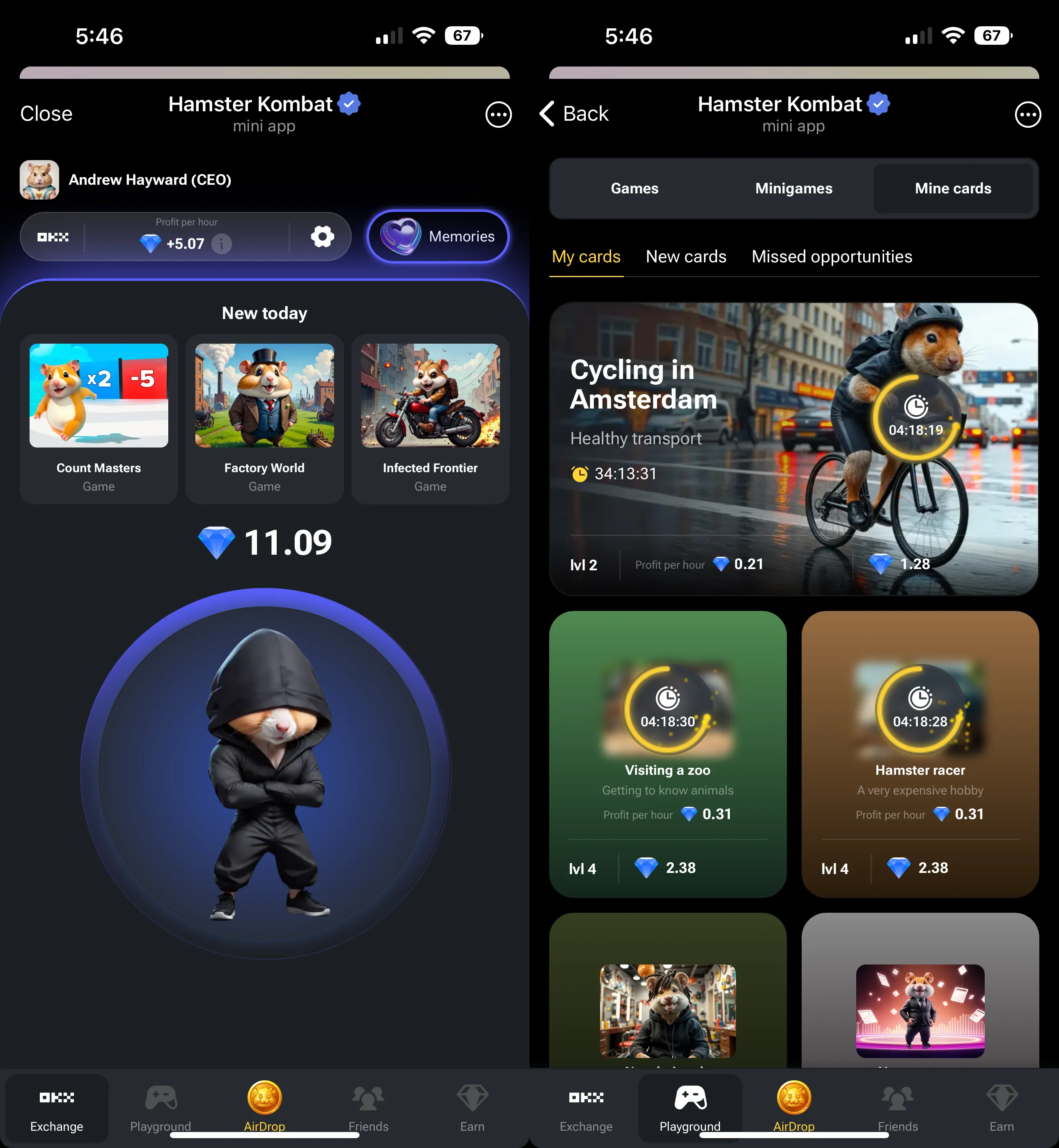 Hit the “Playground” button at the bottom of the screen and then tap the “Mine cards” tab near the top, and you’ll find the familiar slate of upgrade cards. Now they broadly have more of a startup vibe than a crypto-specific one, though as before, some of them seem totally random (see: “Visiting a zoo”).