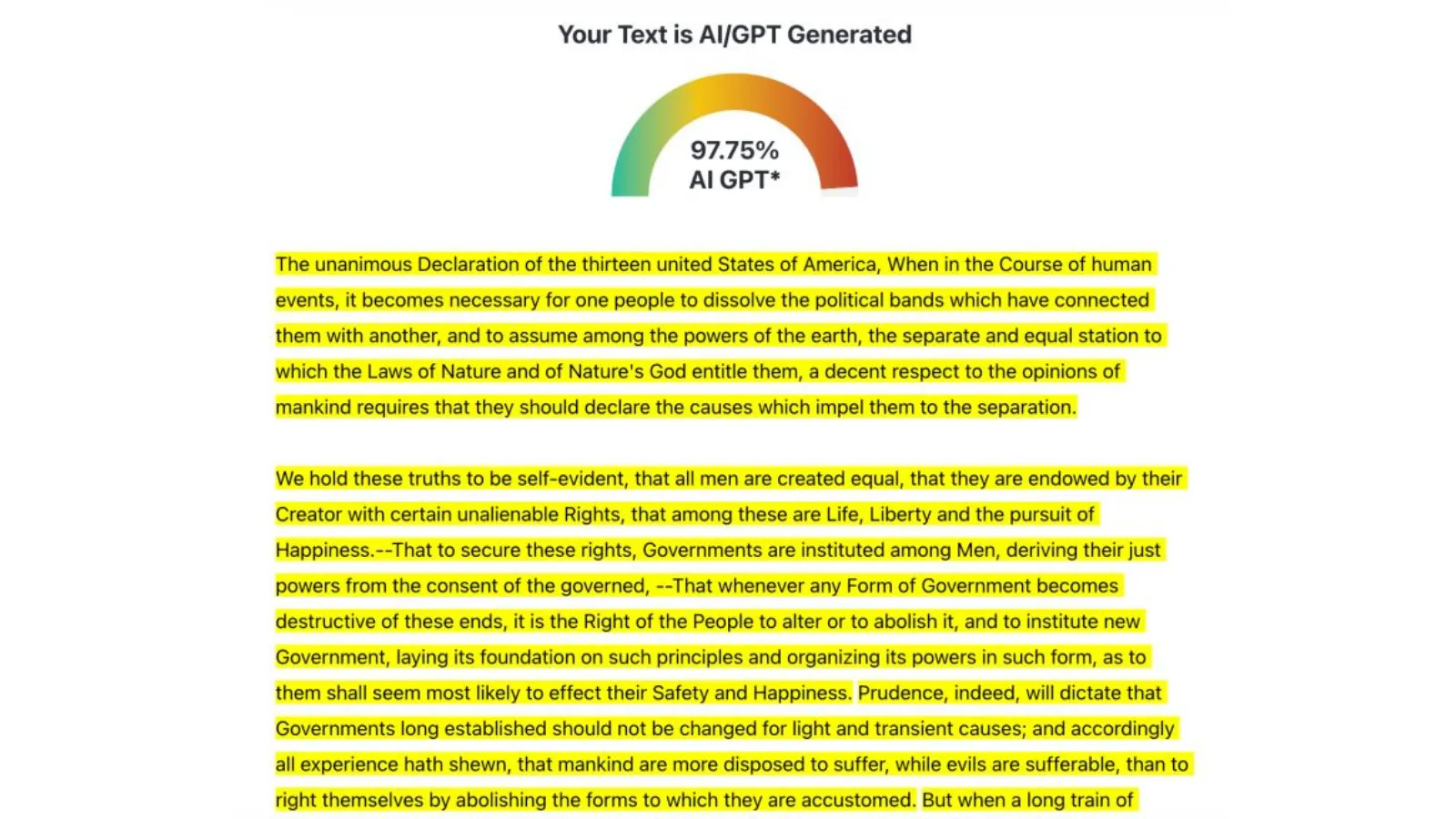 - ZeroGPT totally boffed it and said the Declaration of Independence text was 97.93% AI-generated—even higher than Penn’s findings earlier this month.