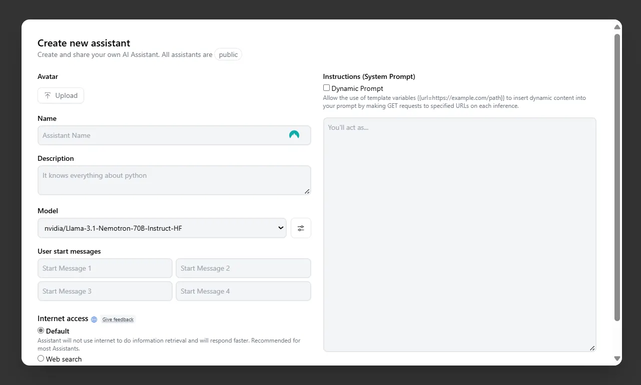 If you want to go deeper and build your custom assistant—basically an open-source version of a GPT—then simply click the “Create Assistant” button on the top right. This will open up a window similar to OpenAI’s custom GPTs interface: