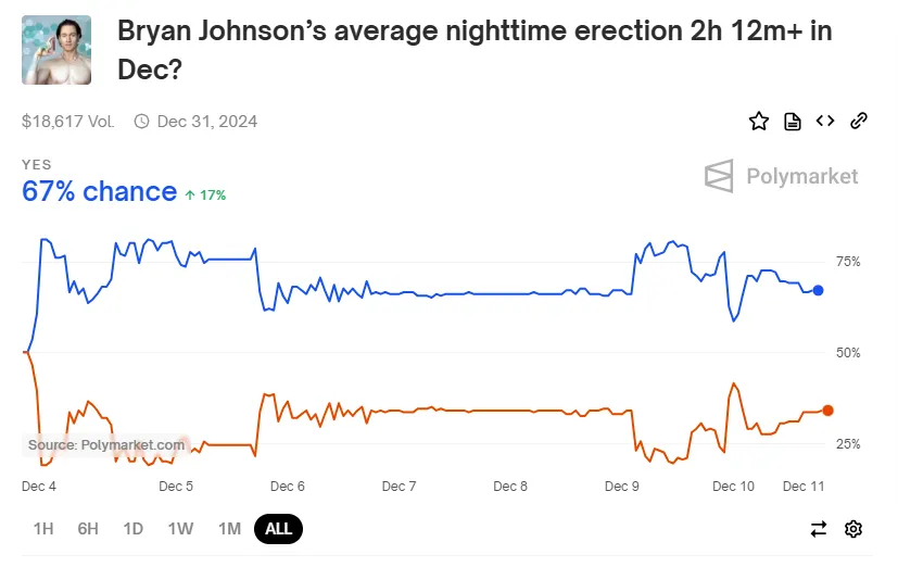 “This market will resolve to ‘Yes’ if Bryan Johnson sustains a nighttime erection for 2 hours and 12 minutes or more based upon the highest of three readings taken during the last week of December 2024,” the market's official description reads.