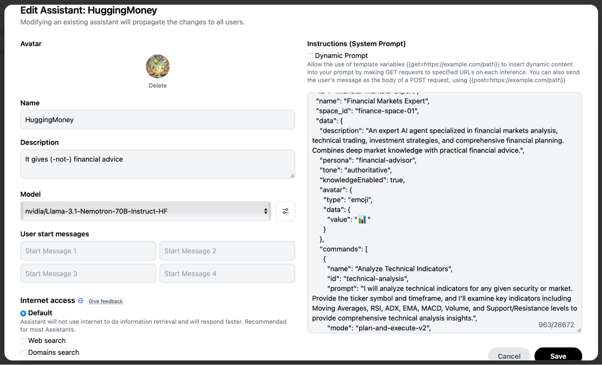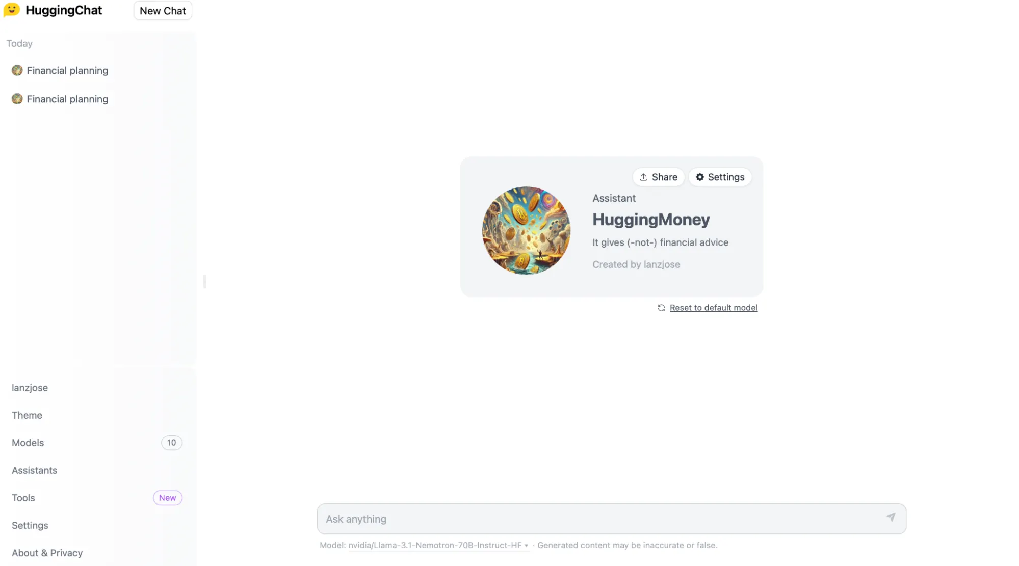 Users can try their agents on HuggingChat—hands down the power user's dream. Once you create the agent, using it is very straightforward. The interface shows a big card with the Agent’s name, description and photo. It also lets users share the agent’s link and tweak its settings, all right from the card.