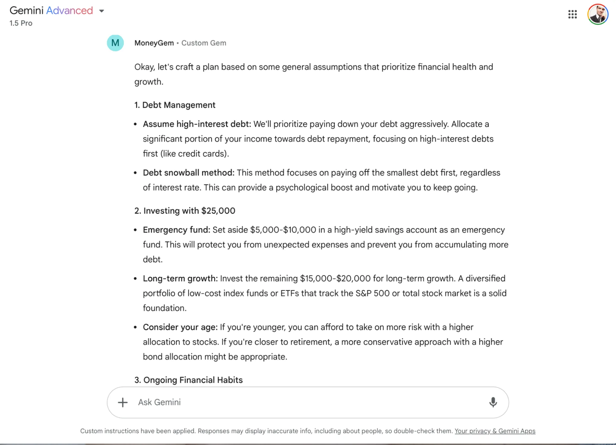 We called our agent MoneyGem and asked for a financial plan. Its consultative approach showcased Google's distinct problem-solving methodology. Instead of giving a straight-up answer, it led with questions like "What kind of debt is it?" and "What are your interest rates?"—showing an understanding that financial advice isn't one-size-fits-all.