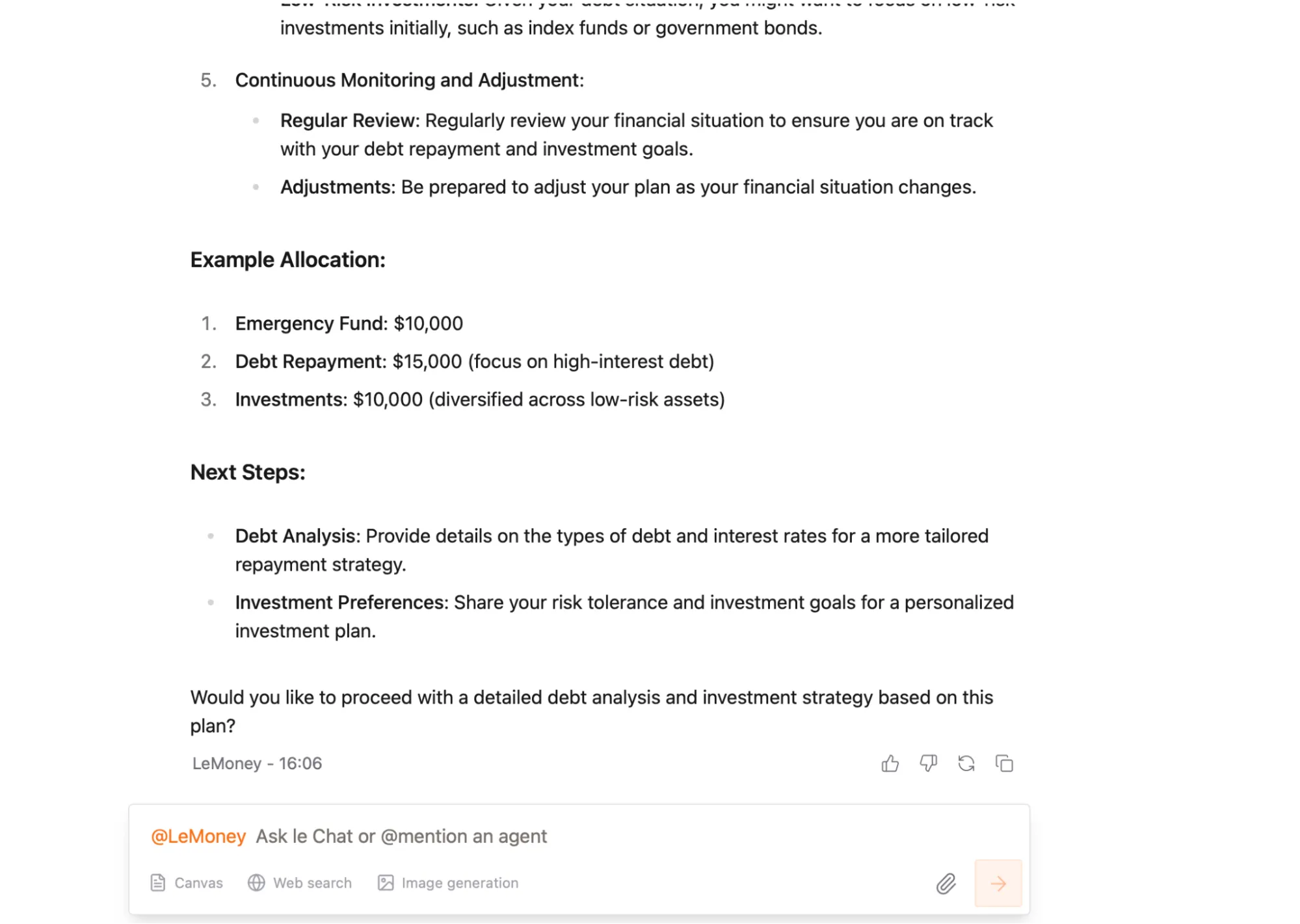 We built our agent, and named it Le Money to honor Mistral’s French roots. Its performance clearly showed Mistral's generalist approach to problem-solving. Its suggestion to "set aside $10,000 for emergencies, $15,000 for debt repayment, and $10,000 for investments" appeared straightforward, but showed that the agents lacked some basic mathematical validation.