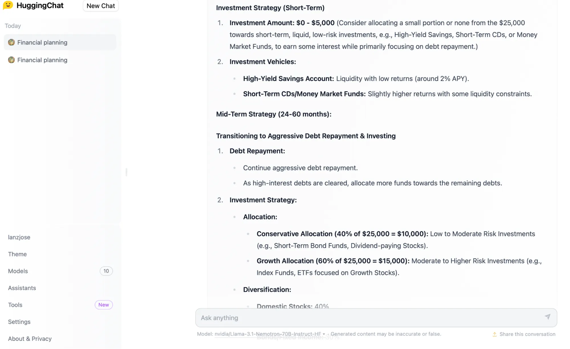 A zero-shot answer was not useful. The agent basically said it did not know the user enough to provide good financial advice. After asking it to make assumptions and forcing it to provide a plan that could fit most scenarios, the agent generated a very conservative draft of a plan without giving specific suggestions on which investments to consider.