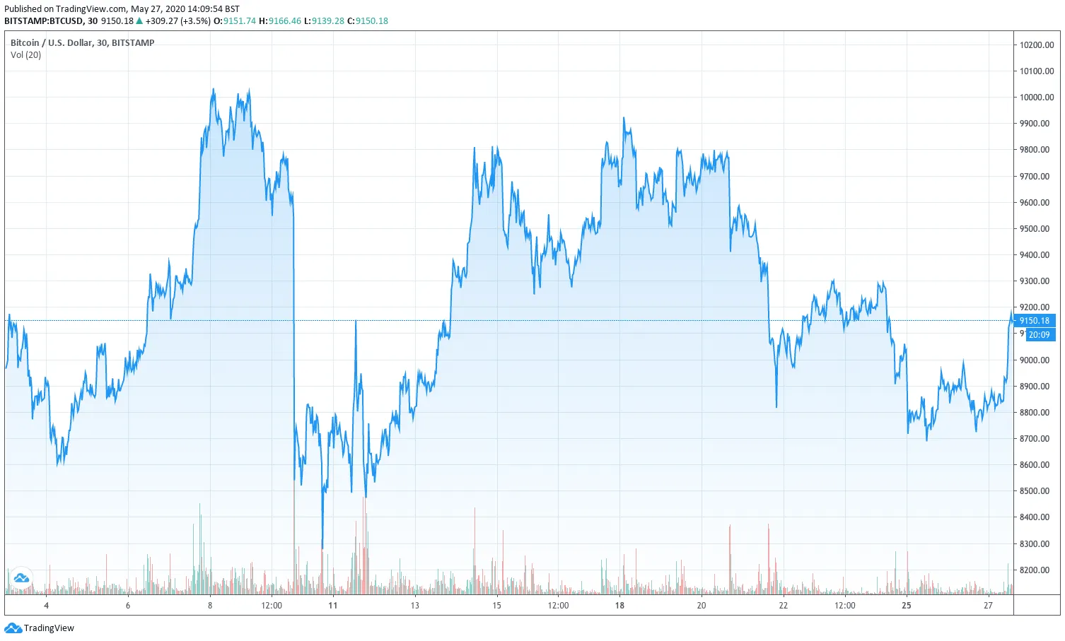 Bitcoin has repeatedly failed to hold $9,000, but is still in the green post halving. (Image: TradingView)