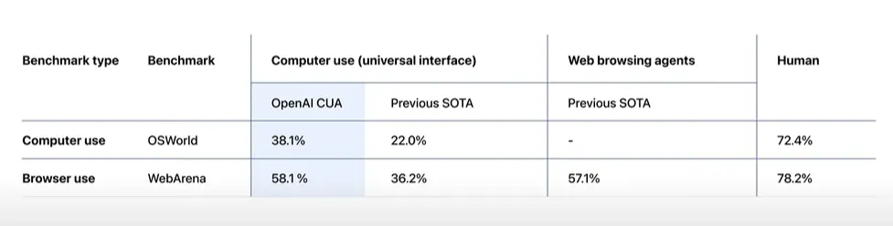 As usual, OpenAI shared some benchmarks: It beats other State-of-the-art models, scoring 38.1% on OSWorld (proficiency at handling standard Operating Systems) vs. 22% by the best competitor and 58.1% on WebArena (handling of e-commerce sites) vs. 36.2% by the competitors.