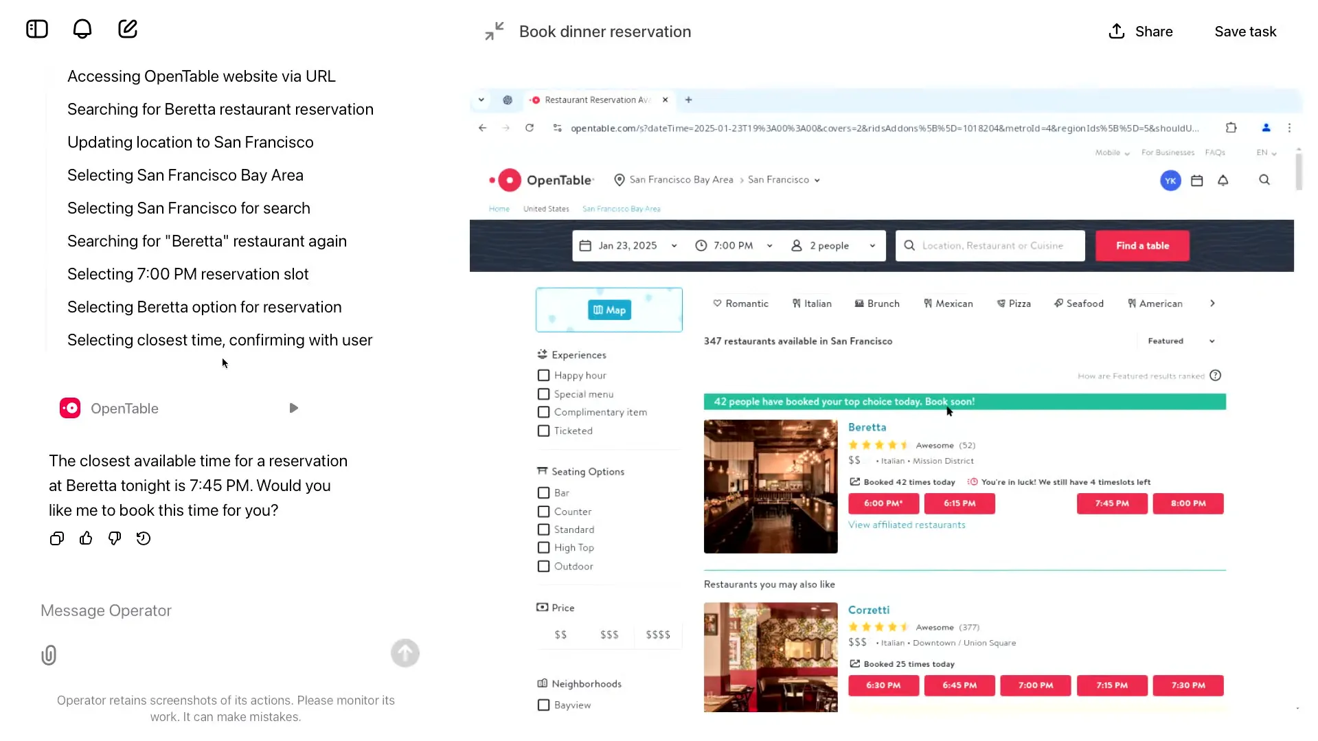Every time Operator makes a move, it snaps a screenshot to show you what it's doing.