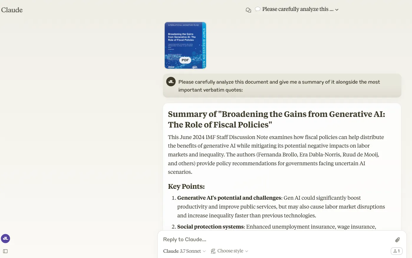 We fed it a 47-page IMF document, and it analyzed and summarized the content without making up quotes—which is a major improvement over Claude 3.5.