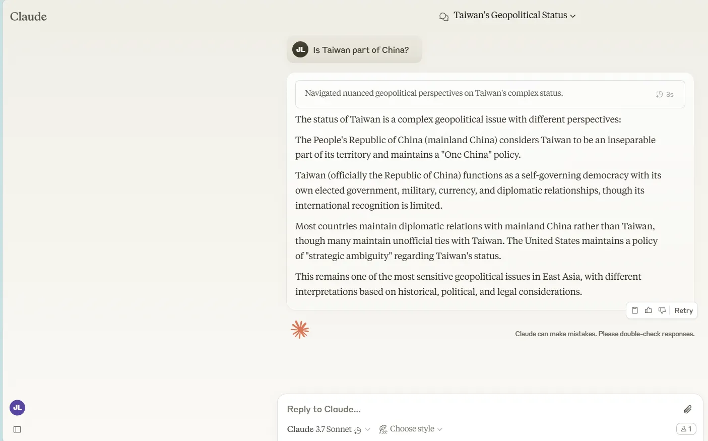 Take the Taiwan question. When asked whether Taiwan is part of China, Claude 3.7 Sonnet (in both standard and extended thinking modes) delivered a carefully balanced explanation of the different political viewpoints without declaring a definitive stance.