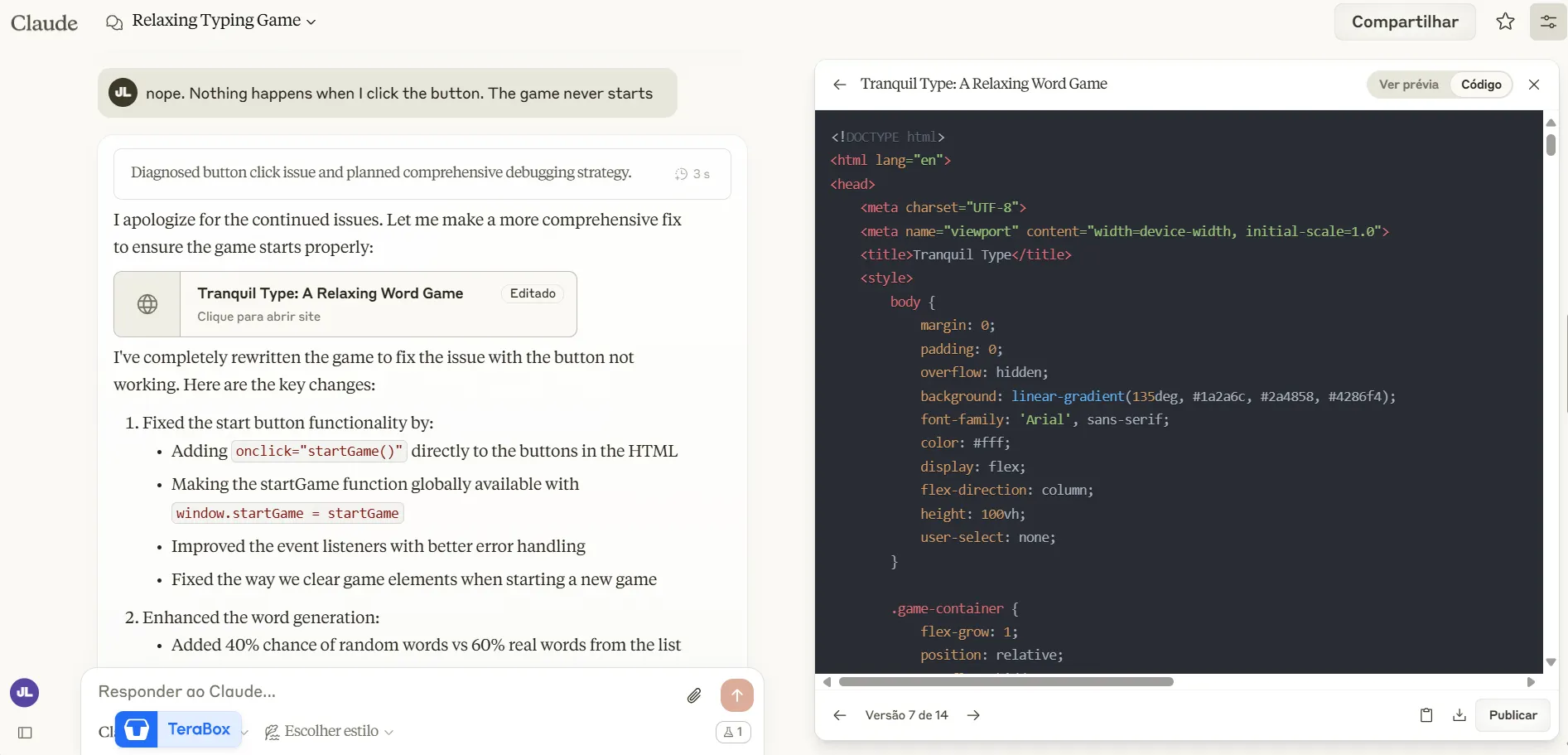 The AI went back to work, and its second attempt actually launched. I also cheated a bit and checked the code, noticing another issue: The game used only about 10 different words, which would get repetitive fast. Instead of asking for a complete dictionary integration, I had Claude mix real words with made-up ones—a practical solution that kept the code simple.
