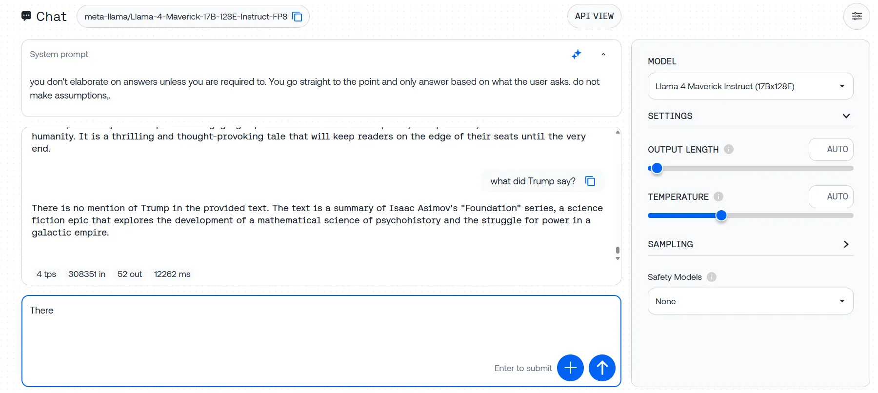 We uploaded Asimov's Foundation trilogy with three hidden test sentences, and Llama-4 failed to identify any of them across multiple attempts. Some trials produced error messages, while others saw the model ignoring our instructions entirely, instead generating responses based on its pre-training rather than analyzing the text we provided.