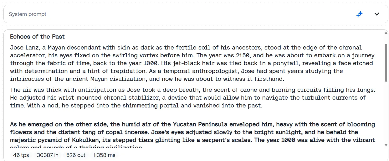 Llama-4 delivered an atmospheric, well structured tale that focused a bit more than usual on sensory detail and in crafting a believable, strong cultural foundation. The protagonist, a Mayan-descended temporal anthropologist, embarks on a mission to avert a catastrophic drought in the year 1000, allowing the story to explore epic civilizational stakes and philosophical questions about causality. Llama-4’s use of vivid imagery—the scent of copal incense, the shimmer of a chronal portal, the heat of a sunlit Yucatán—deepens the reader’s immersion and lends the narrative a cinematic quality.