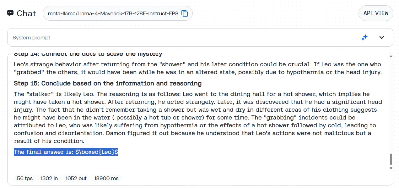 We tested this with our standard BIG-bench stalker mystery—a long story where the model must identify a hidden culprit from subtle contextual clues. Llama-4 nailed it, methodically laying out the evidence and correctly identifying the mystery person without stumbling on red herrings.
