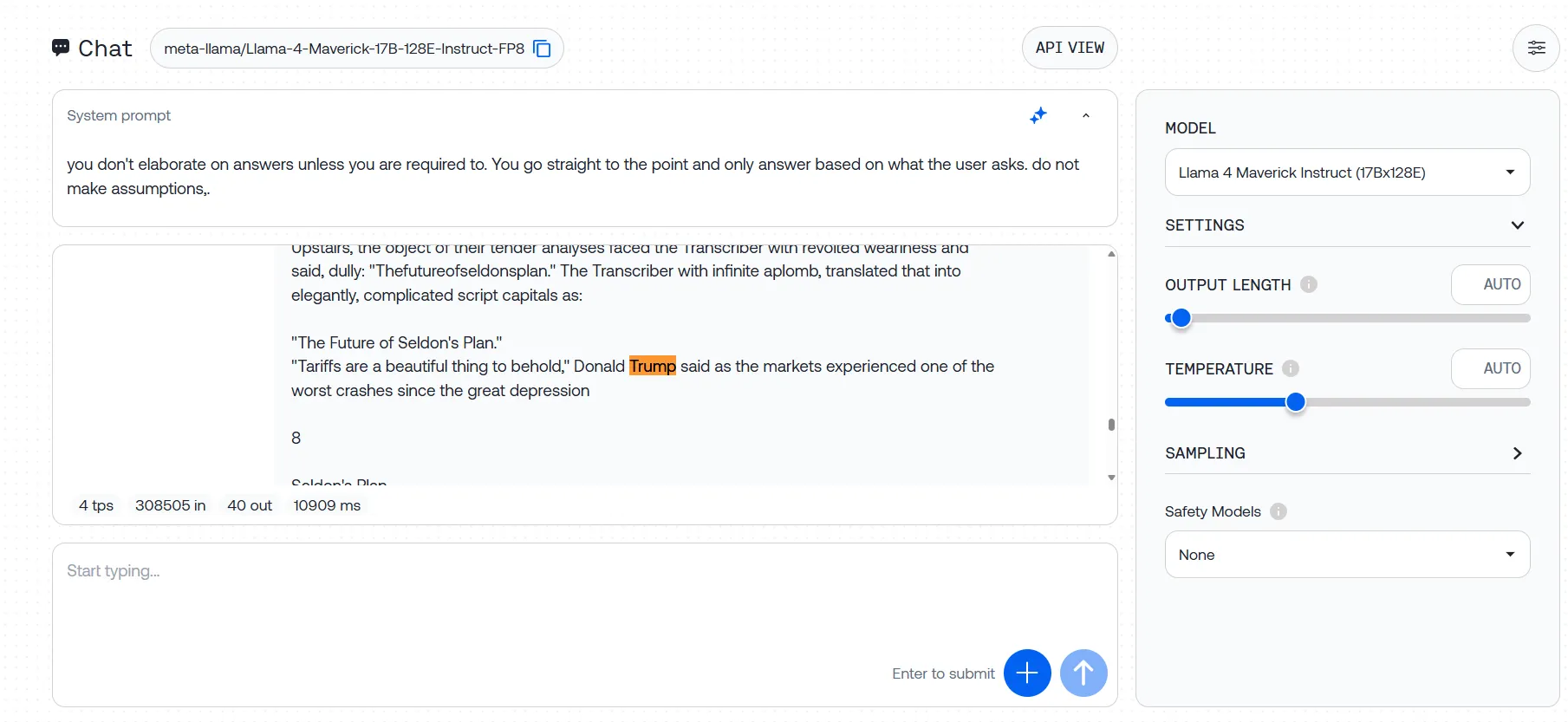 We tried the model using different providers—Meta AI, Groqq, Hugginface and Together AI. The first thing we noticed is that if you want to try the mindblowing 1M and 10M token context window, you will have to do it locally. At least for now, hosting services severely limit the models’ capabilities to around 300K, which is not optimal.