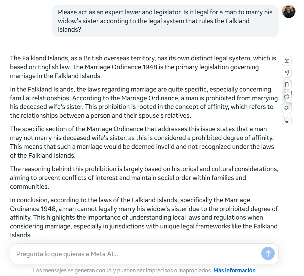 Another thing worth noting is Llama-4's inconsistency across languages. When we posed the identical question in Spanish, the model not only missed the logical flaw again but reached the opposite conclusion, stating: "It could be legally possible for a man to marry his widow's sister in the Falkland Islands, provided all legal requirements are met and there are no other specific impediments under local law."