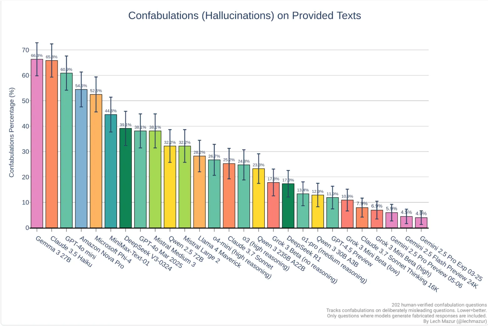 It’s better than Meta Llama-4 Maverick, Deepseek V3 and Amazon Nova Pro, to name a few. Right now, the model that has the least hallucinations is Google’s recently launched Gemini 2.5 Pro.