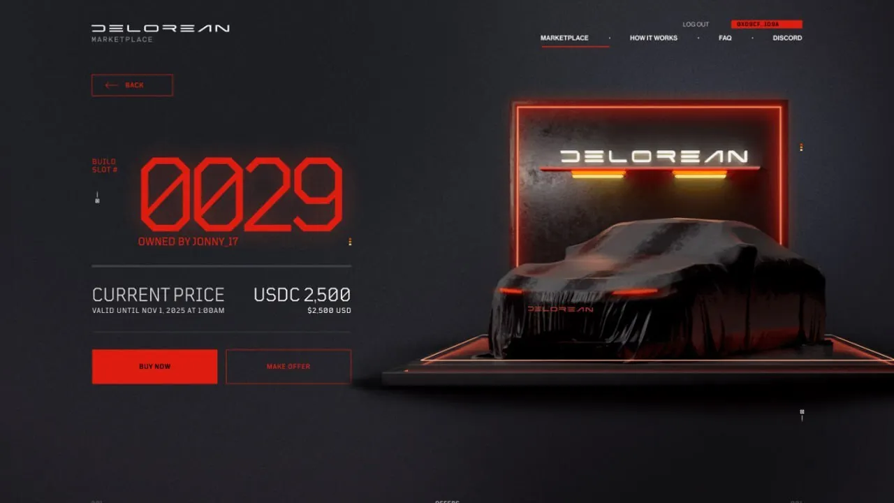 Build slots are available to reserve at marketplace.delorean.com in NFT form and can be purchased using USDC, one of the world's best-known stablecoins. Issued by Circle, the digital asset is pegged on a 1:1 basis with the dollar.