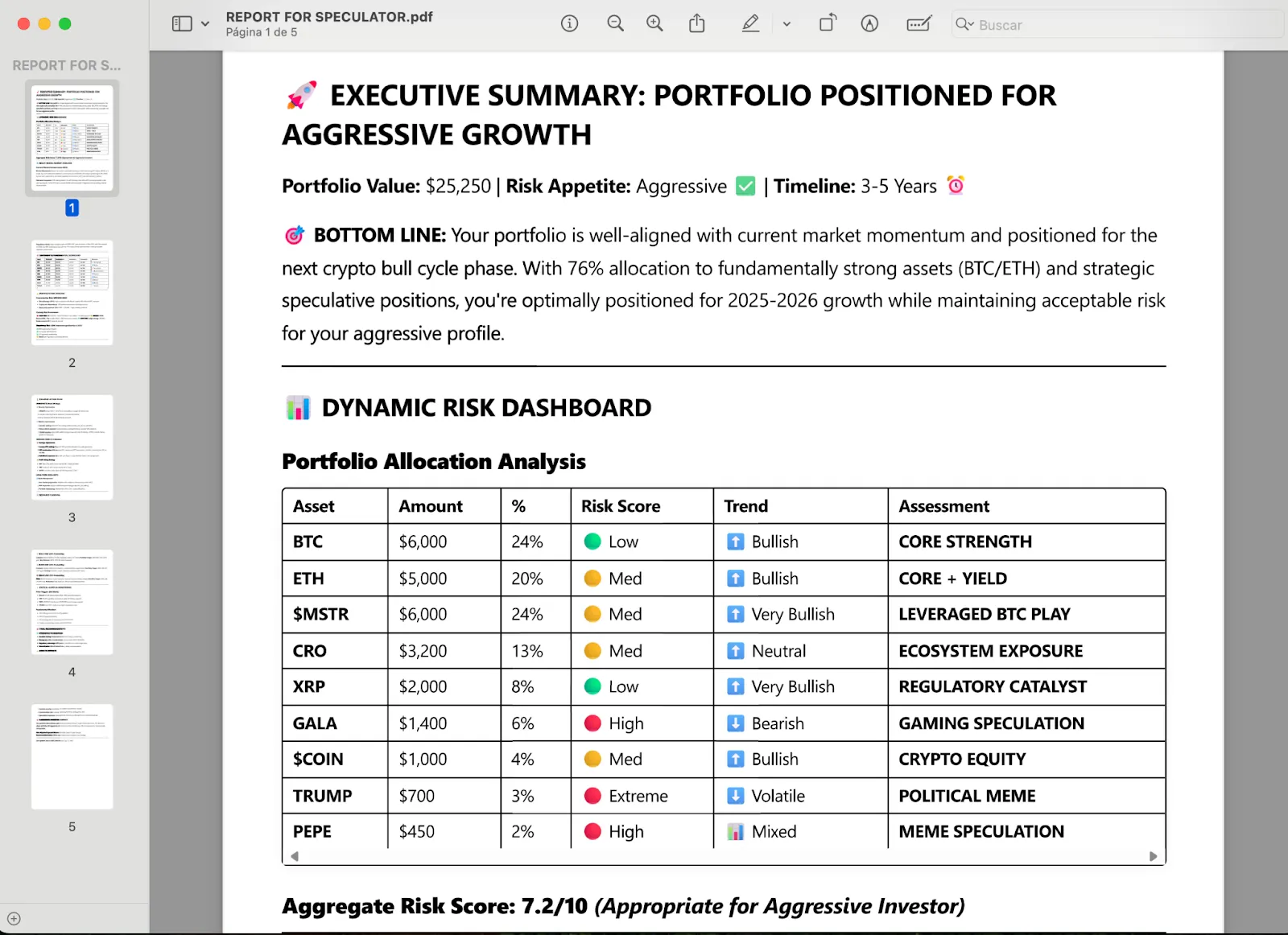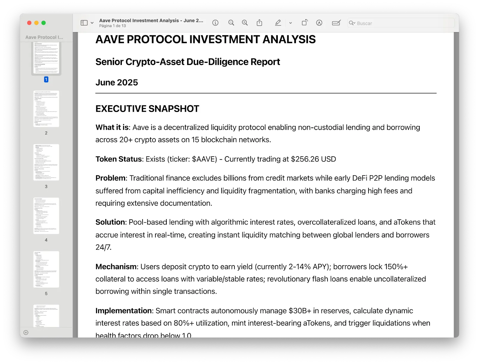 The system delivered risk-scored sections, historical performance context, and an executive investment thesis complete with allocation strategies. Users can iterate on reports, requesting deeper analysis or scenario modeling for specific protocol features.