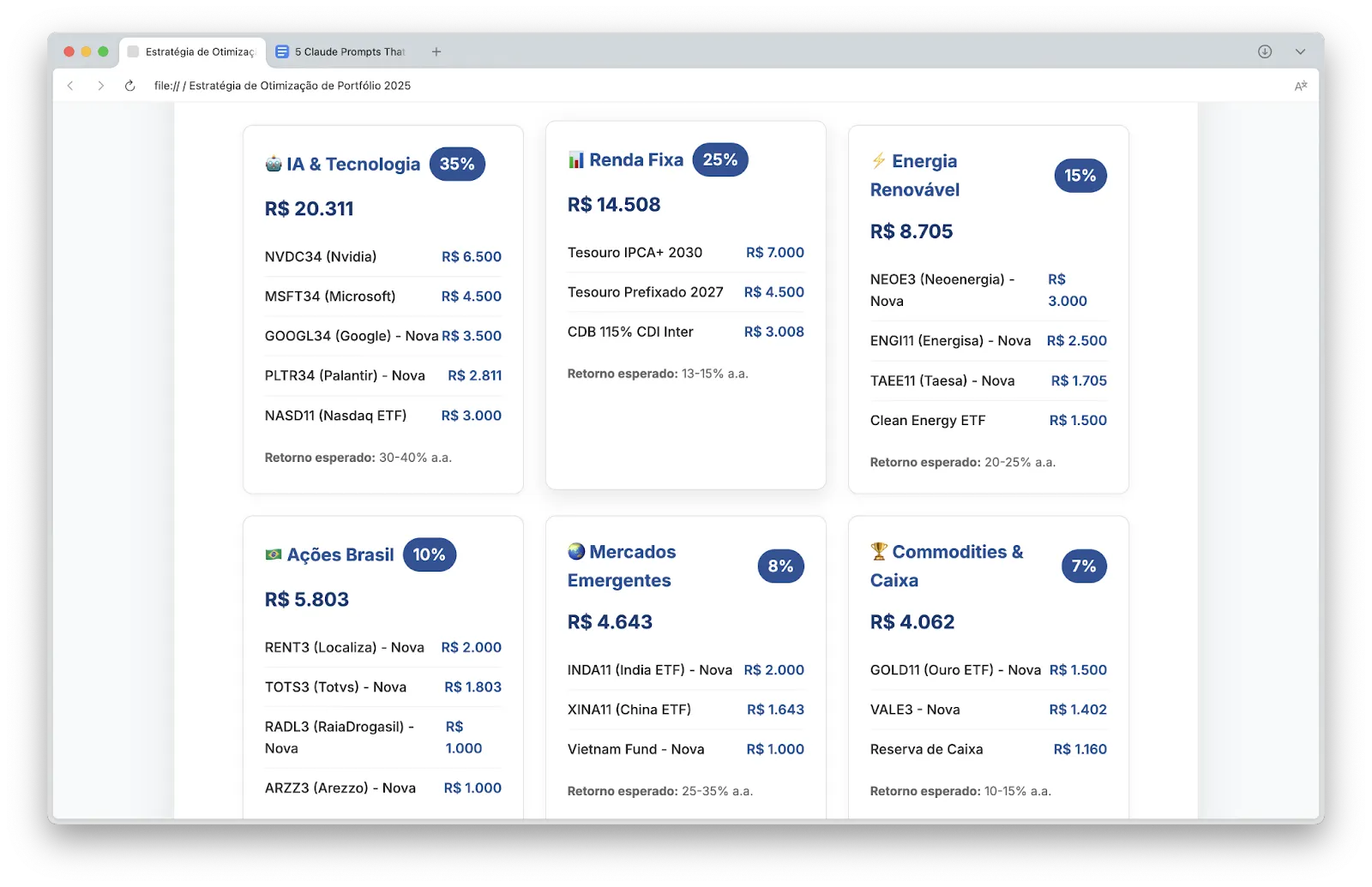 The analysis included stress testing against market crashes, inflation shocks, and recession scenarios. Recommendations spanned equity reduction, fixed income increases (in Brazil, interest rates are set at around 14.75% per year!), currency hedging, and international diversification across AI, renewable energy, and emerging market sectors.